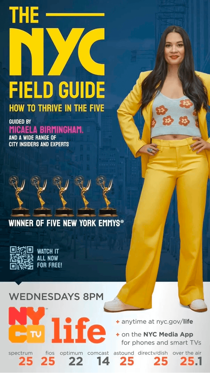 Micaéla is writer, host and co-producer of the New York City Field Guide, a 13-episode television series. Each 30-minute episode features expert tips and interviews with iconic New Yorkers for thriving in the greatest city in the world. The series won 5 Emmy Awards and has been renewed for Season 2 which will premiere in 2026.